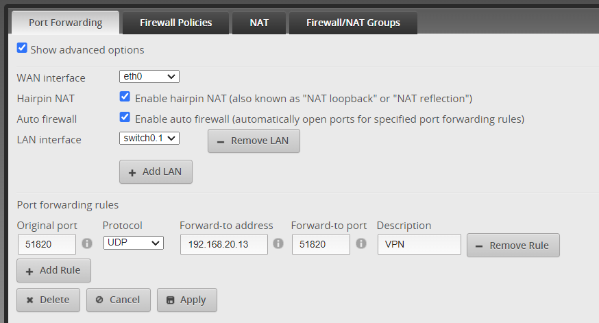 The WireGuard server (host A) must be reachable from the internet. Therefore you’ll have to port forward UDP port 51825 on Host A (server). The screenshot below shows how to set this up on a EdgeRouter X. Port forwarding is not necessary on host B as this VM acts as a client.