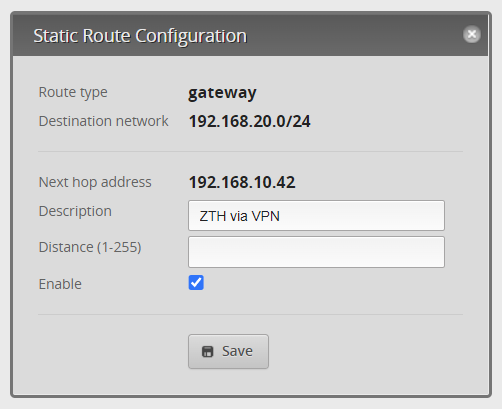 On the EdgeRouter of both networks you add a static route by clicking on 'Add Static Route' and then entering the information below. On the router of host A add the IP range of host B as destination network and the IP of host A as next hop address. The same goes for the router in the network of host B, but then the other way around.